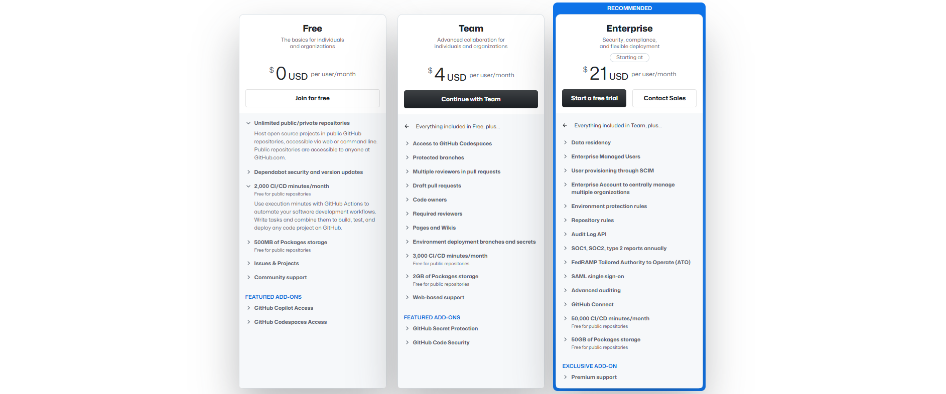 Team — everything needed for the coordinated work of a small group: access rights differentiation, private repos, Jira integration, tech support.